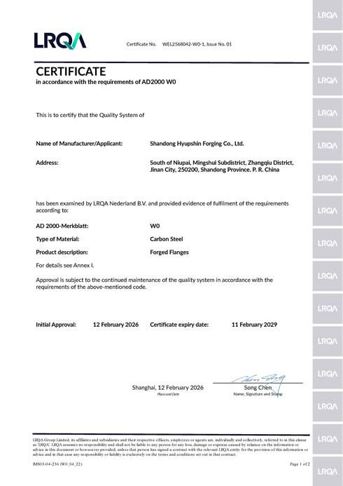 · Notified Body:Lloyd's (LRQA); · Certificate Scope:Manufacturing of Forged Flanges, See annex to certificate; · Certificate No.0343/SHA/PED/WEL2568042/01; · Certificate Verifying Page:https://www.lrqa.com · See what steel materials have certified